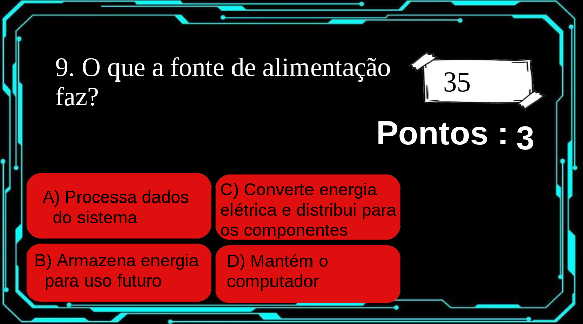 O propósito deste projeto é um jogo educativo focado no aprendizado da matéria de Arquitetura e Organização de Computadores, oferecida no curso técnico em Informática do Centro de Educação Profissional onde foi desenvolvido . A ideia nasceu das dificuldades que os alunos mostram ao entender os temas teóricos, causadas principalmente pela falta de materiais práticos. Levando em conta que os estudantes são nativos digitais, a gamificação foi escolhida como método de ensino para fazer o aprendizado ser mais interativo e interessante. O jogo, feito na plataforma Construct 3, visa simplificar a compreensão das ideias de hardware e estrutura computacional, funcionando também como um recurso de suporte aos professores e incentivando um aprendizado mais dinâmico e fácil.